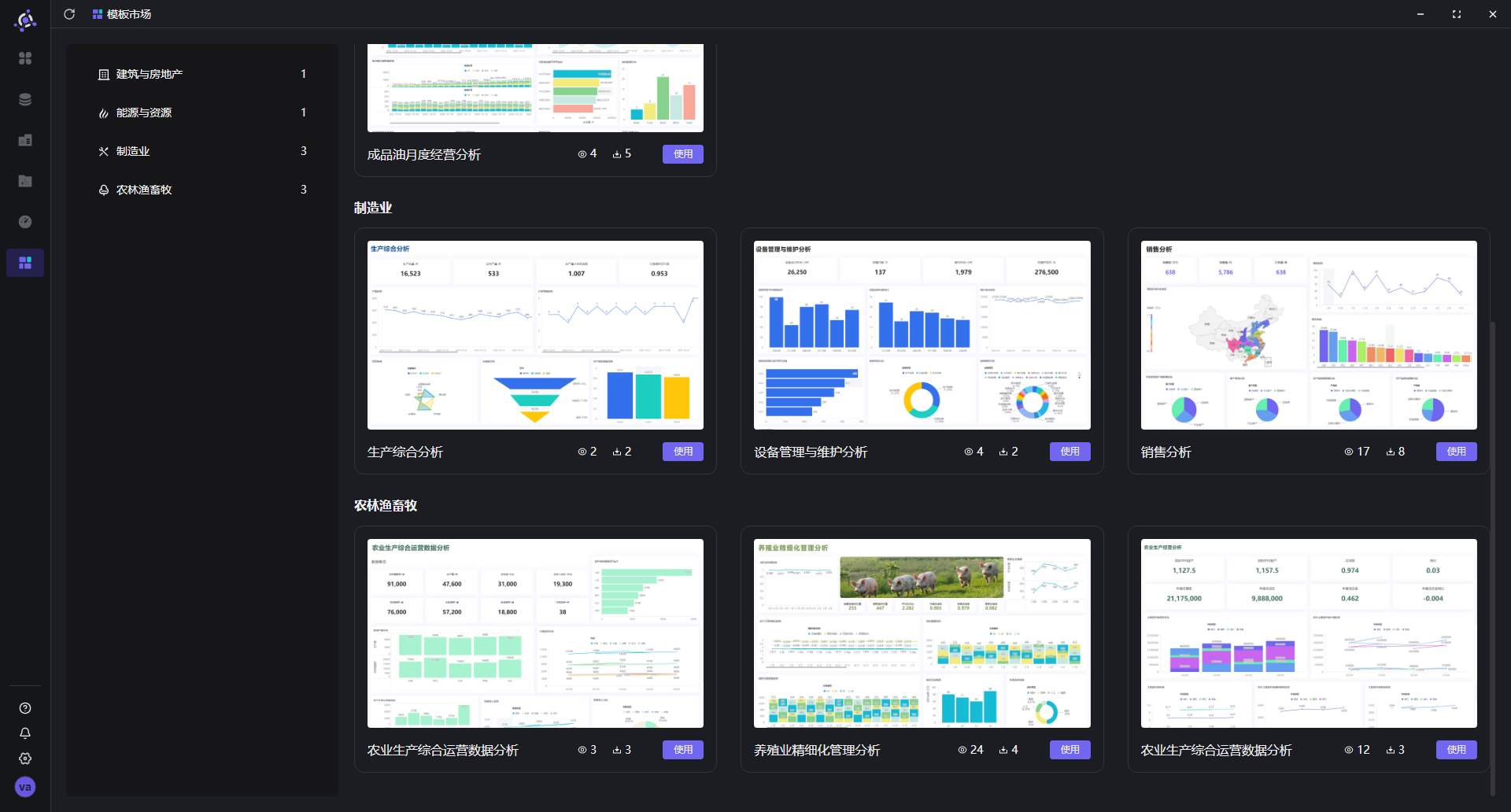 在这个过程中,我们发现助睿BI的模板市场提供了一个很好的起点。企业可以根据自身行业特点,选择合适的分析模板,快速启动数据应用。