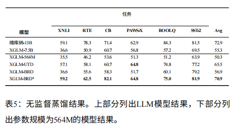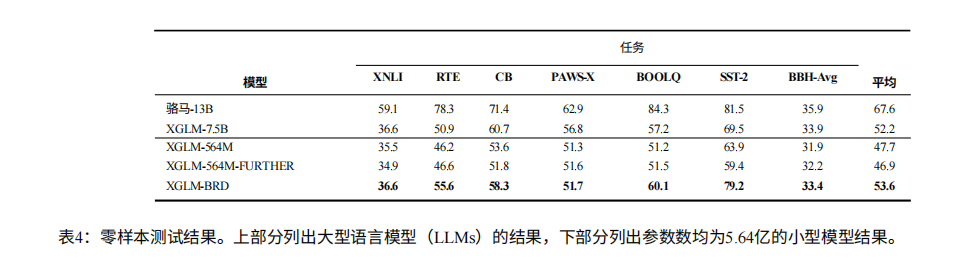 - 与 130 亿参量的教师模型 Vicuna-13B 相比,XGLM-BRD2 在 XNLI、CB、PAWS-X、SST-2 四项任务上表现更优,真正实现了 “以小胜大”。
