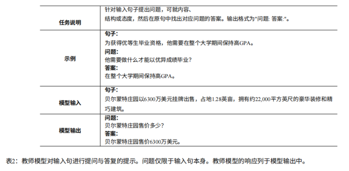 除了提取信息,BRD 还让小模型学习 “主动提问”:引导教师模型围绕句子的内容、结构或态度生成问题,并从原句中找到答案,比如: