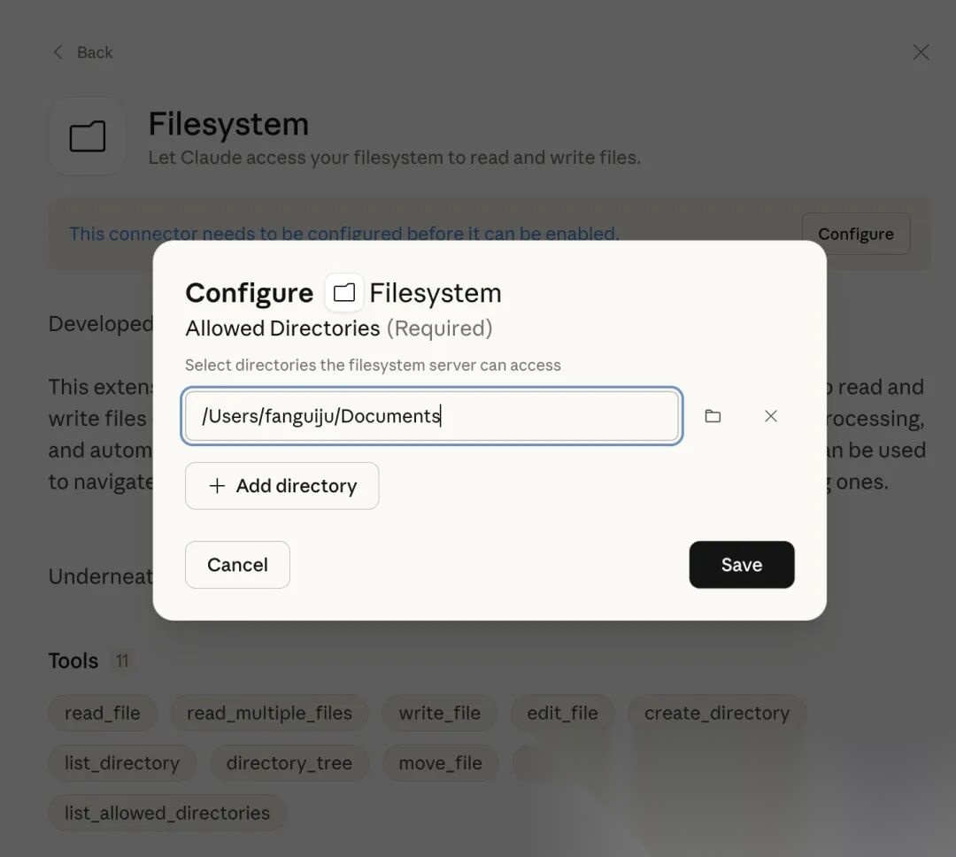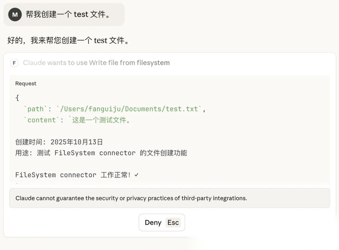 在使用过程中,FileSystem MCP Server 会访问 MacOS 的文件系统,并且在执行 Tools 的时候它始终会要求人工确认。这符合 MCP 安全设计理念。