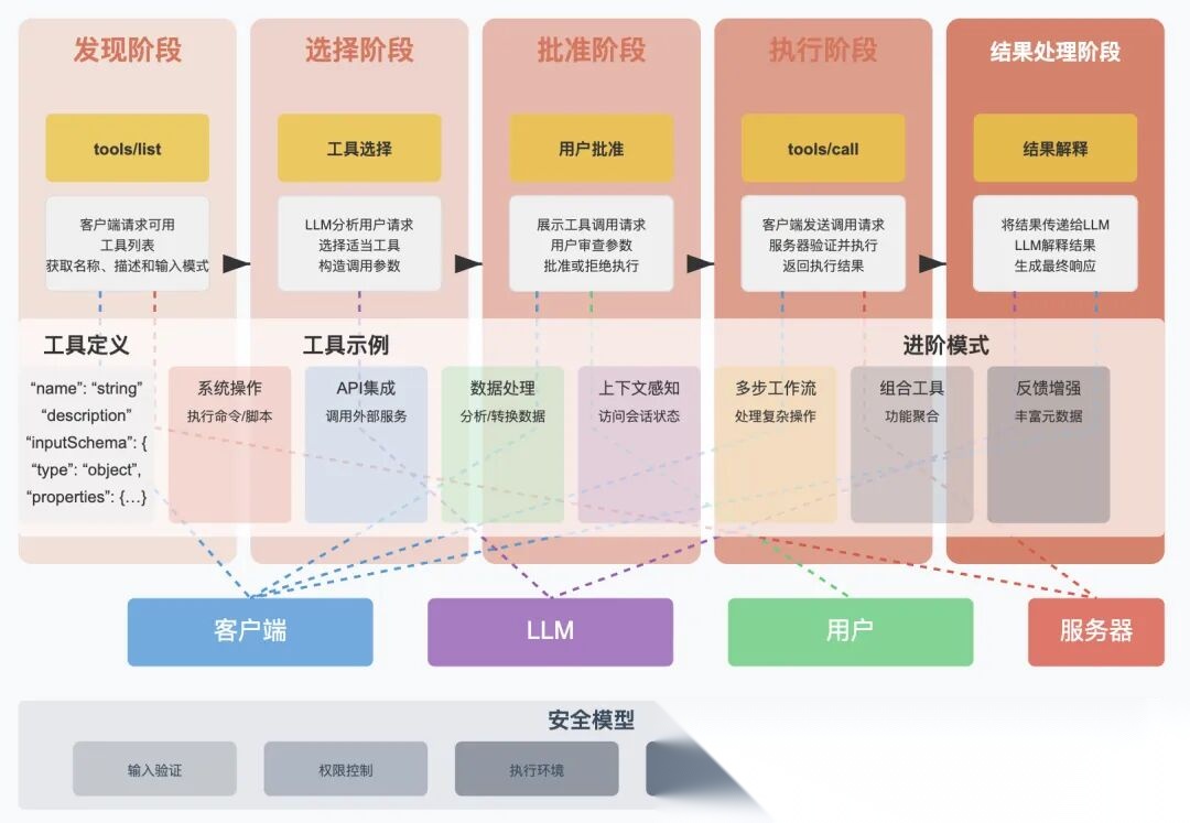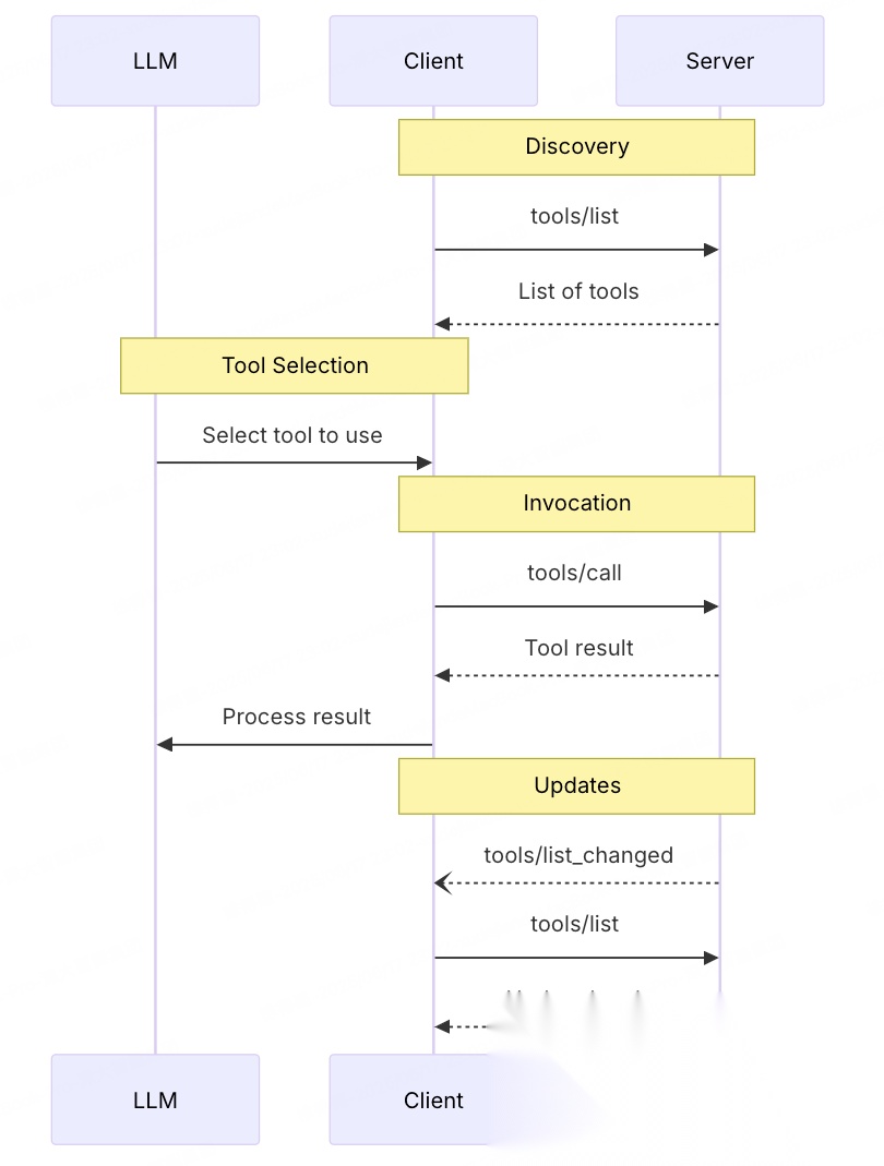 - 然后 MCP Host 将这些 Tools 输入到 LLM。LLM 接收到这些信息后,会选择使用某个工具。然后 MCP Host 再向 MCP Server 发送具体某个工具的使用请求,并收到工具执行结果。