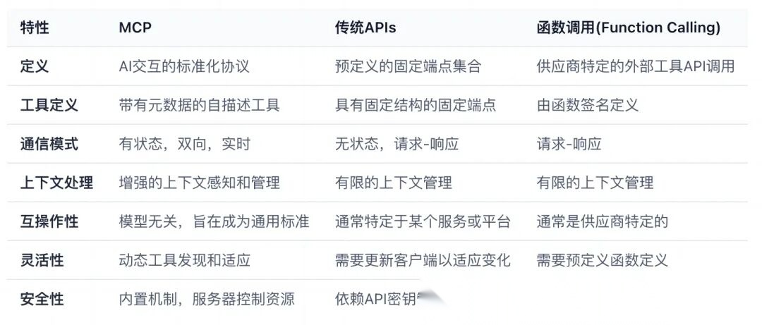 虽然 MCP 在某些方面和 RESTful API 以及 Function Calling 类似,但它们之间有很大的区别。