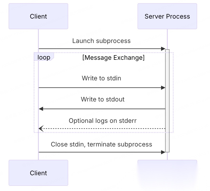 Stdio 适用于本地集成,特别适合同一机器上的通信。Client 和 Server 通过 OS/Kernel 的 stdin、stdout、stderr 管道进行数据传输。