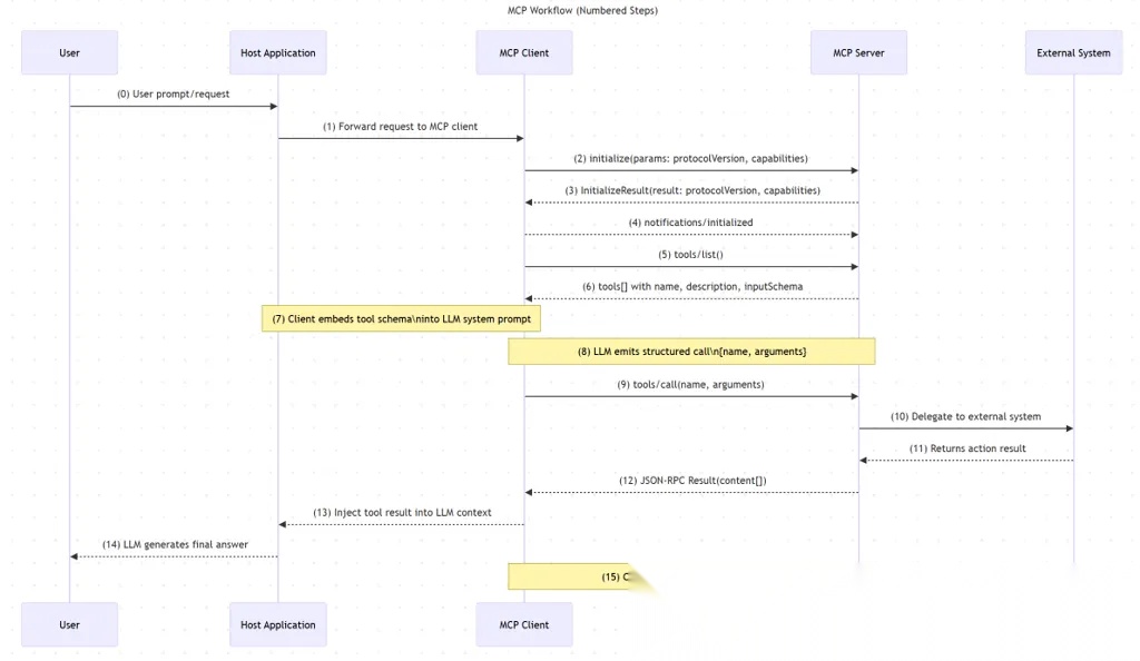 - 最后,MCP Host 将工具执行结果输入到 LLM。LLM 返回最终的响应结果给用户。