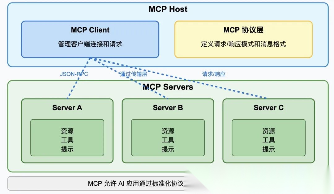 在 MCP 架构中,Host 和 Client 紧密协作。Host 提供 Agent 运行环境和安全边界,Client 负责具体的协议实现和通信管理。分层设计使 MCP 既灵活又安全,能够适应各种 AI 应用场景。