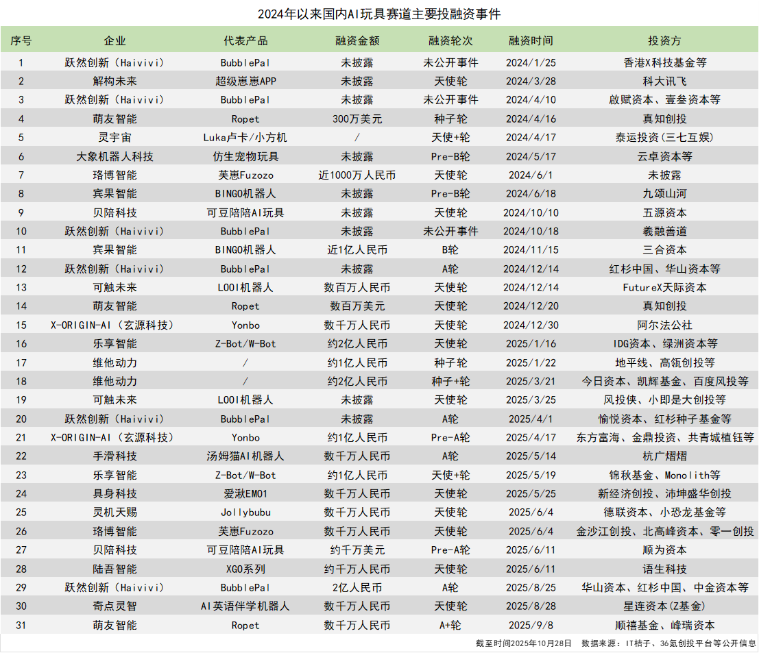 据蓝鲨财经社不完全统计,2024年至今,国内AI玩具赛道已发生至少31起投融资事件,其中2025年以来的主要投融资就有16起,且不乏多起亿级、千万级投资,投融资数量和金额双增长。