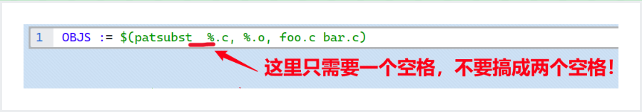 其效果是:将字符串 foo.c、bar.c 中符合模式 %.c 的单词替换成 %.o,返回结果为 foo.o 和 bar.o