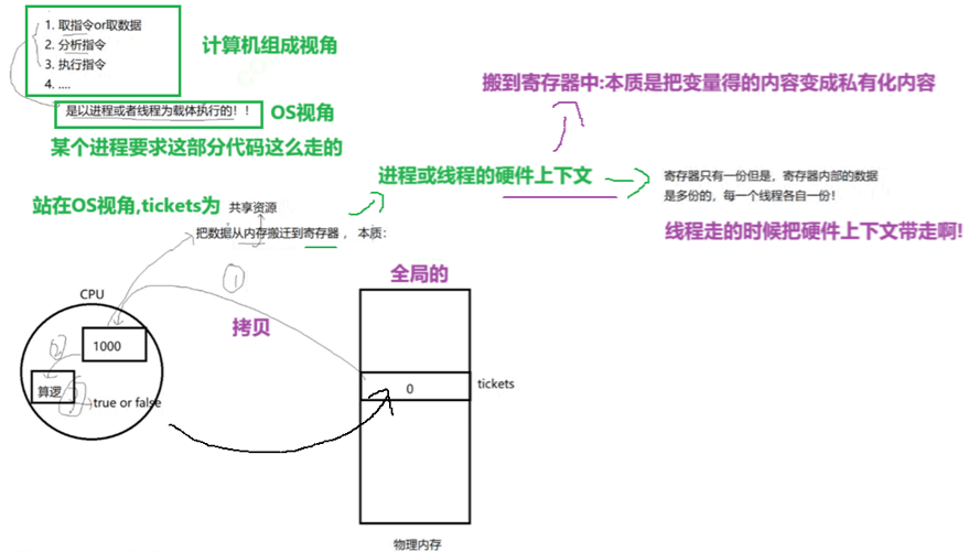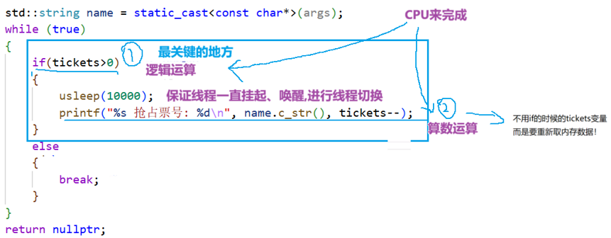 当前正在执行线程A的代码,此时经过了逻辑运算进入了判断体内,但因为usleep或时间片到了被切走了,要保存硬件上下文,带走了数据1000;调度线程B,做了tikets--,把票数干到了0,退出.此时线程A被唤回来了,还认为票数为1000,执行printf .tikets--,重新获取内存的值0,进行算术运算,改为了-1,修改tikets本身的值,写回到物理内存.
