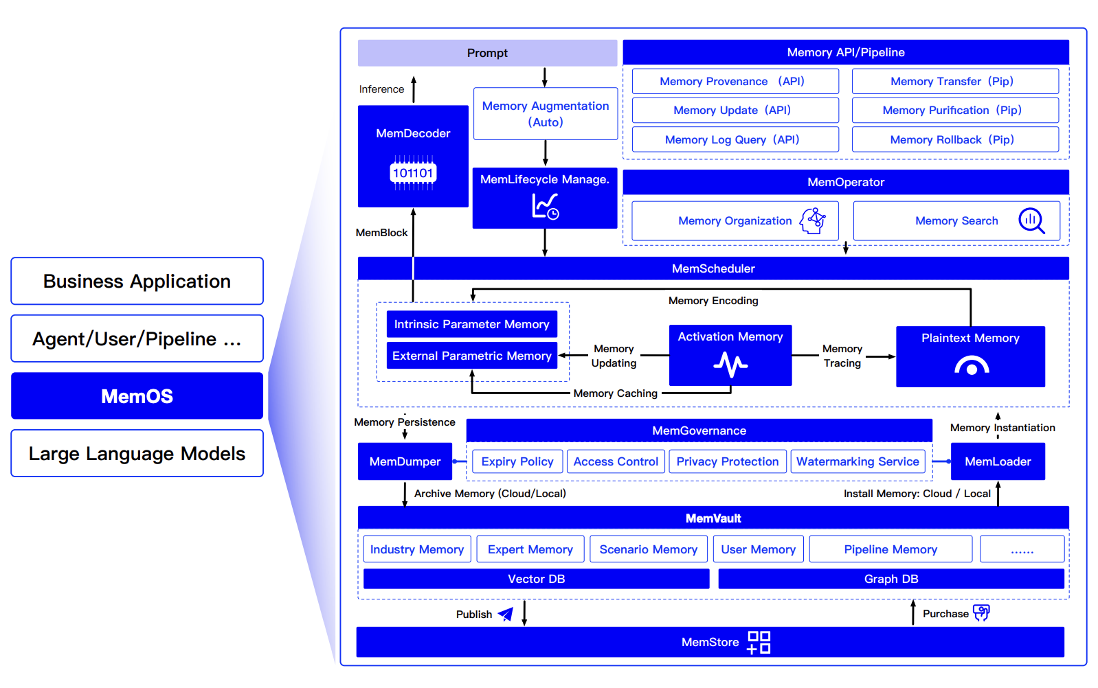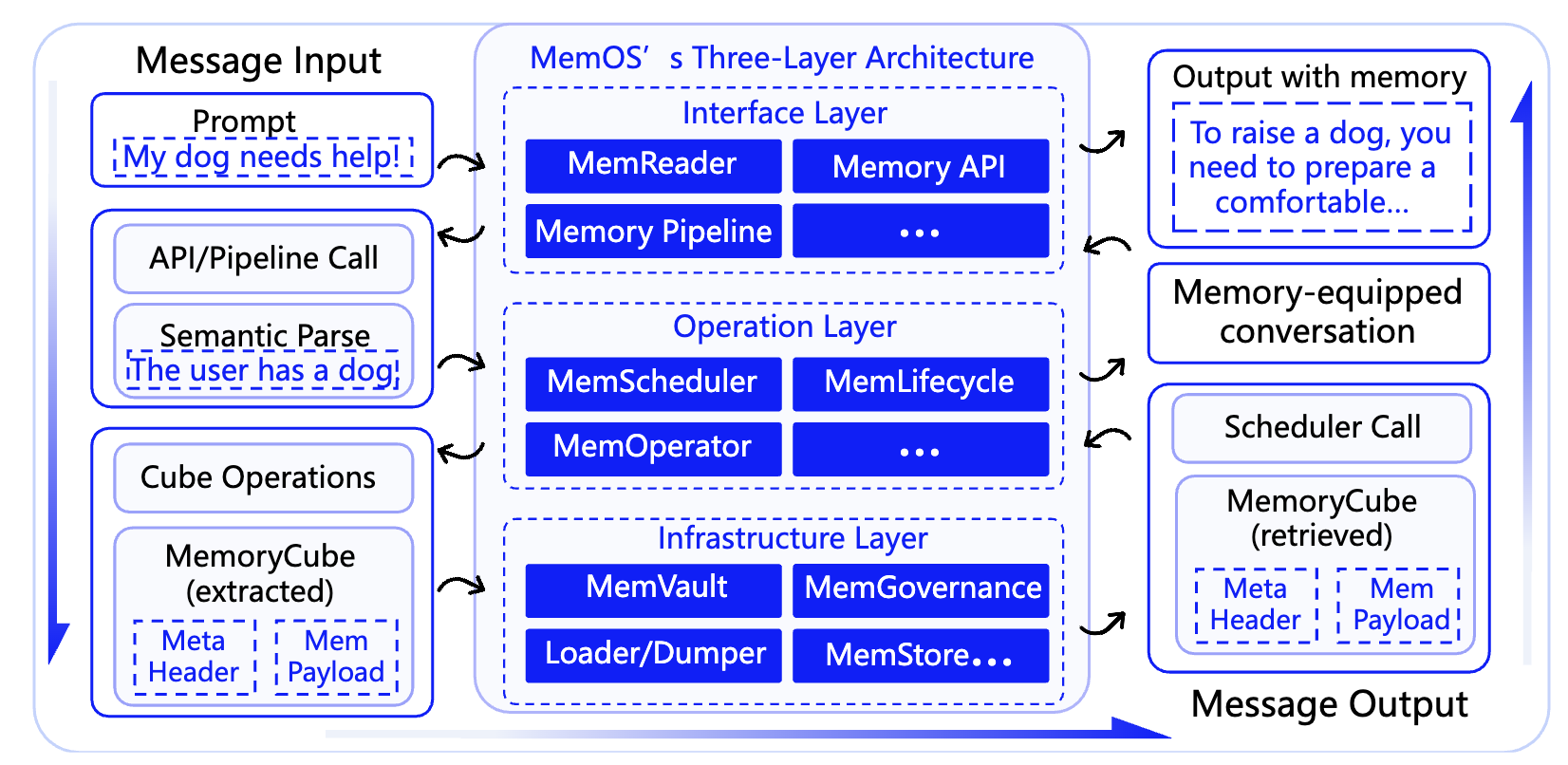 换句话说,MemOS 是让 AI “长记性” 的操作系统。它不仅存数据,还能在推理中动态调度、复用和更新这些记忆。