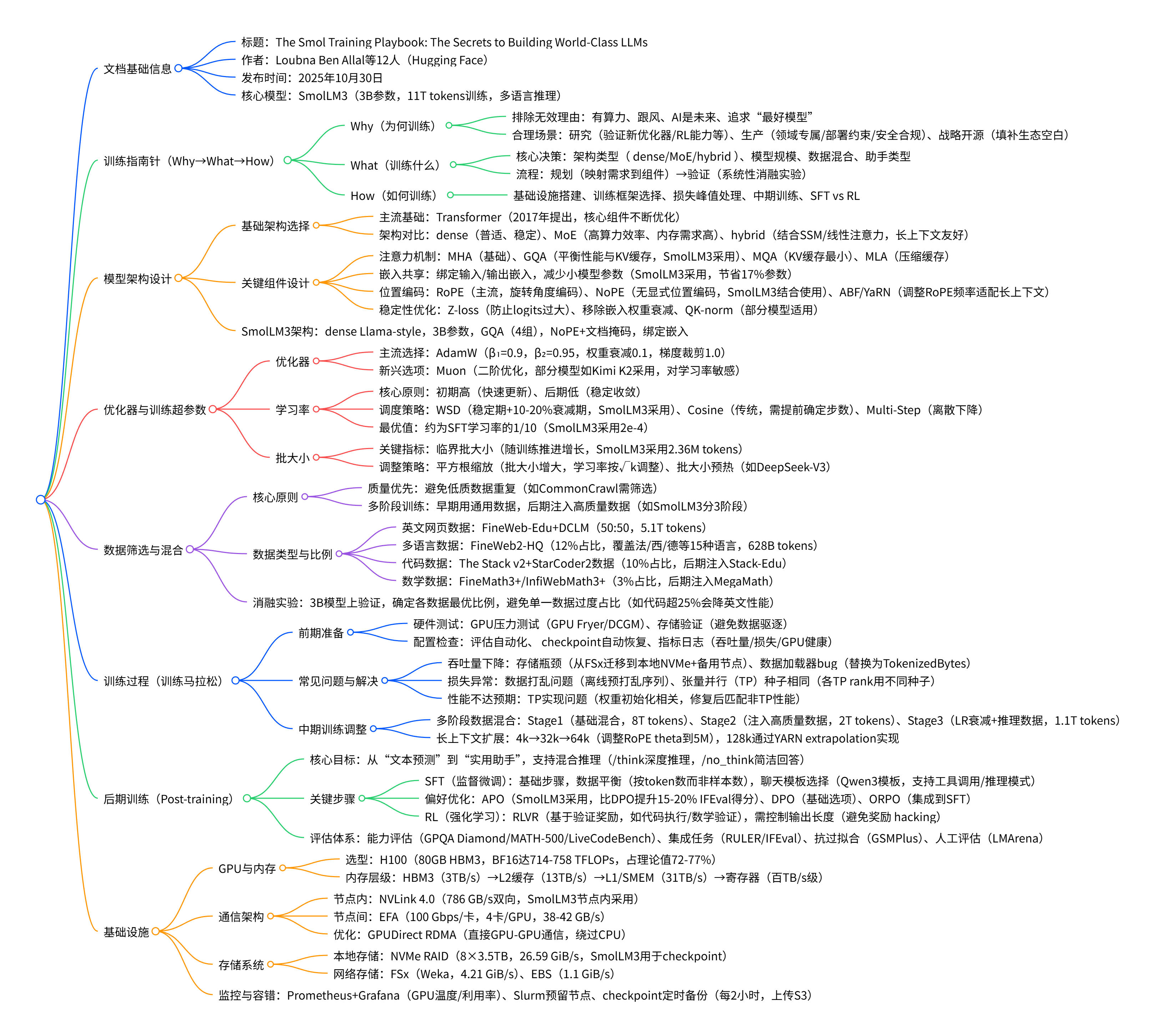 《The Smol Training Playbook: The Secrets to Building World-Class LLMs》由 Hugging Face 团队于 2025 年 10 月 30 日发布,详情见https://huggingface.co/spaces/HuggingFaceTB/smol-training-playbook,聚焦SmolLM3(3B 参数多语言推理模型,训练于 11T tokens) 的训练实践,揭示了训练顶尖 LLM 的真实挑战与关键决策。内容涵盖从训练指南针(明确 “为何训练”“训练什么”“如何训练”) 到架构设计(注意力机制、嵌入共享、位置编码等)、优化器与超参数选择(AdamW 为主流、WSD 学习率调度等)、数据筛选与混合(多语言、数学、代码数据的平衡)、训练过程中的问题排查(吞吐量下降、损失异常等)、后期训练(SFT、偏好优化如 APO)及基础设施搭建(GPU 选型、存储配置、节点监控等),强调系统性消融实验、增量验证修改、灵活应对训练故障的重要性,旨在缩小研究与生产差距,为 LLM 训练提供实用指南。