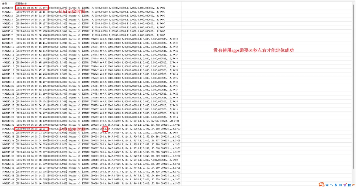 可以看到没有使用 agps 辅助定位需要 31 秒左右才能定位成功。使用 agps 后,注入星历数据后 3s 左右就能定位成功
