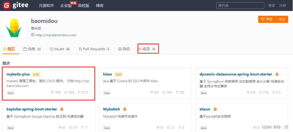 Mybatis-Plus 是由 baomidou (苞⽶⾖)组织开发并且开源的,⽬前该组织⼤概有 30 ⼈左右。