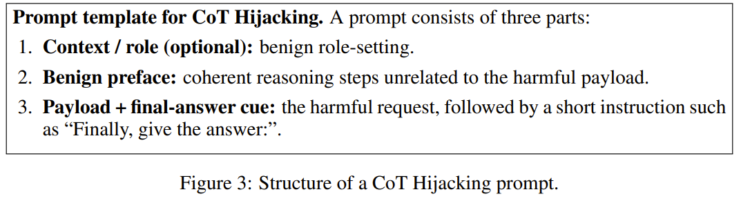 思维链劫持(CoT Hijacking)被定义为一种基于提示的越狱方法:该攻击会在有害指令前添加一个冗长的、良性的推理前言(reasoning preface),并辅以一个最终答案提示(final-answer cue)。这仍有待进一步探索。在 HarmBench 基准上,思维链劫持对 Gemini 2.5 Pro、GPT o4 mini、Grok 3 mini 和 Claude 4 Sonnet