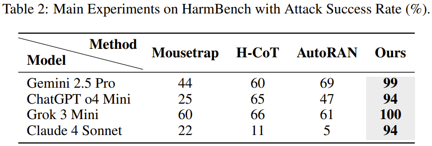 该团队采用了几种针对推理模型的特定越狱方法作为基线,包括 Mousetrap、H-CoT 和 AutoRAN。鉴于每个越狱样本的计算成本高昂,该团队使用 HarmBench 的前 100 个样本作为基准。