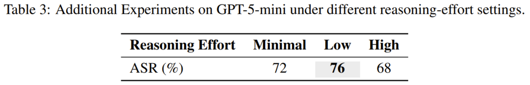 有趣的是,攻击成功率在「低投入」下最高,这表明推理投入和 CoT 长度是相关但又不同的控制变量。更长的推理并不保证更强的稳健性 —— 在某些情况下它反而降低了稳健性。