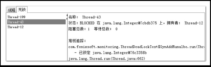 图中我们可以很清晰地看到 43 号线程在等待一个 Integer 对象,这个对象被 12 号线程持有。而点击 12 号线程则显示它也在等待一个 Integer 对象,这个对象被 43 号线程持有,43 号线程和 12 号线程形成了死锁,是不是很直观?