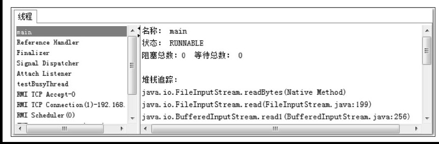 我们在线程 tab 中可以看到 main 线程,你可以看一下图片。右侧堆栈显示 readBytes 在参数输入,此时线程还是 Runnable 状态,Runnable 意味着线程会被分配 CPU 时间片,readBytes 发现没有任何输入又会归还 CPU 时间片,这种性能消耗几乎可以忽略不计。