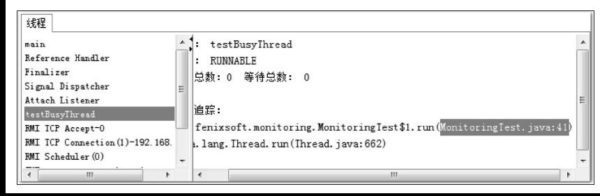 接着监控 test1 线程,test1 线程执行的是自旋操作,从右侧的堆栈中我们可以发现线程此时在 MonitoringTest.java 代码的 41 行,而第 41 行就是死循环。显然这种自旋会极大浪费 CPU 资源。