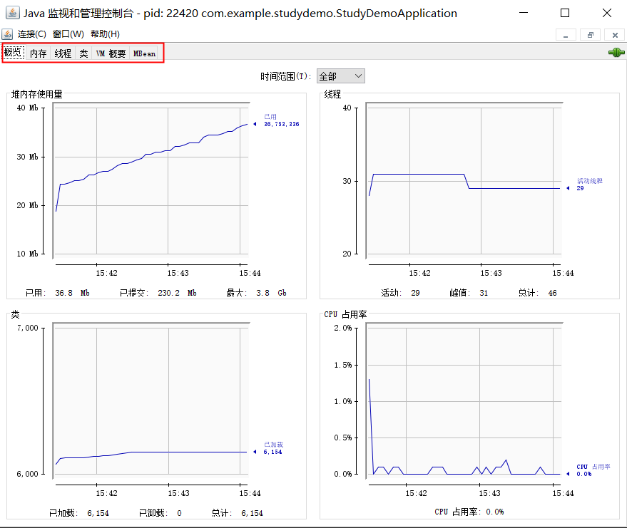 我们可以看到,JConsole 启动时在本地进程中会列出所有 JVM 进程 PID,相当于可视化的 jps 命令。我本机现在运行的几个虚拟机进程分别是 StudyDemoApplication、JConsole、jps 和 idea。现在我们双击 StudyDemoApplication 进去看看。