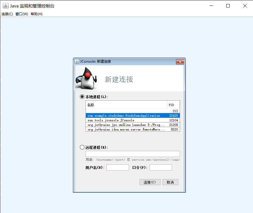 首先我们先找到 JDK/bin 目录下的 JConsole 命令,启动 JConsole。下图是我本机的 JConsole 启动界面。