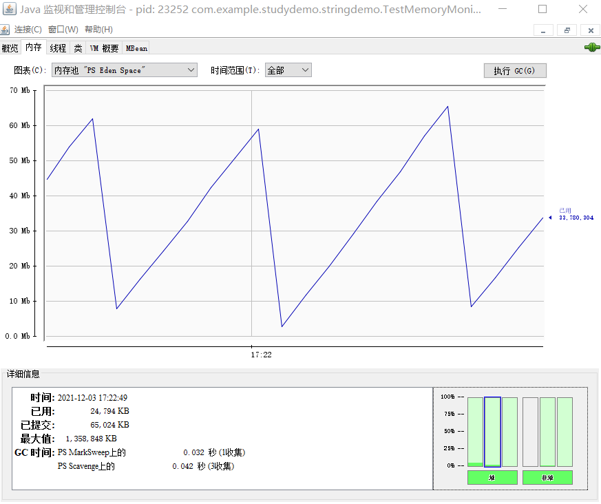 程序运行后,连接一下运行的 PID。在图表列表中,选择 内存池“PS Eden Space”,我们一起来看下内存的使用情况。