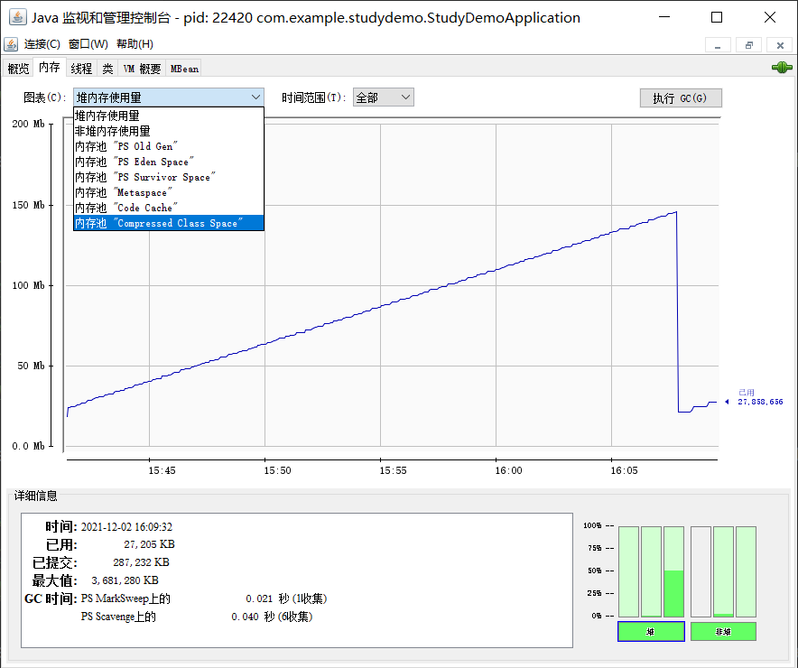 我们可以看到在开始往堆填充数据时,出现了一条匀速向上的、趋近直线的折线。每隔 30 毫秒停止填充,曲线急剧下降,周而复始直至完成。我们再来看看图表右下角的柱状图,当 for 循环执行结束,我们执行 System.gc() 后,Eden 和 Survivor 区中的空间几乎都被释放了,但是老年代的已使用空间还在缓慢增长。