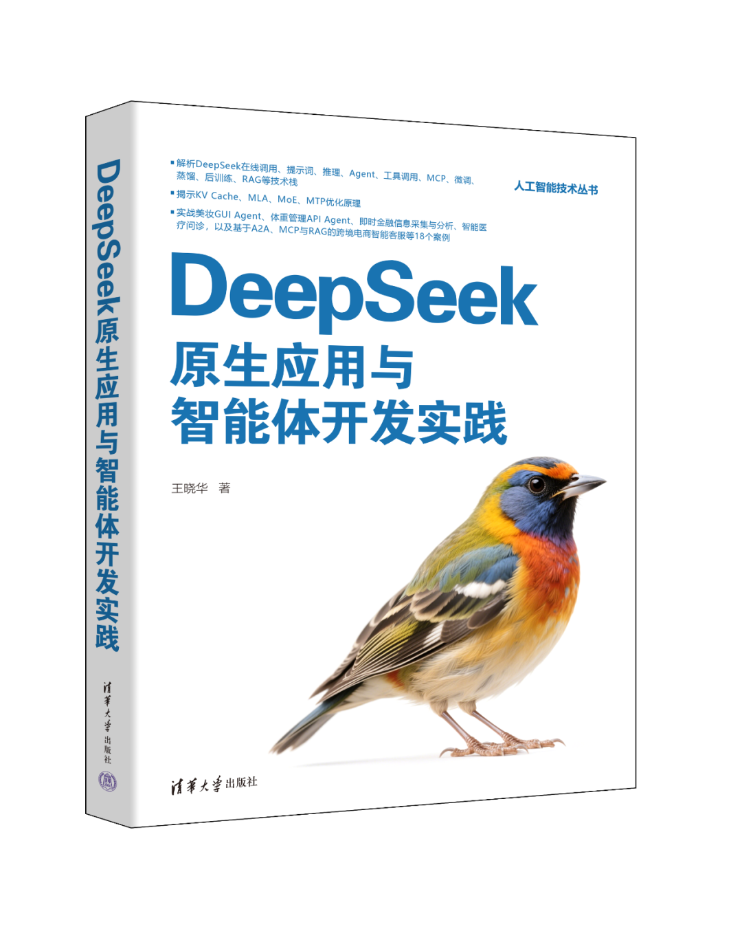 本书围绕DeepSeek大模型应用开发,系统讲解在线调用、提示词、推理、Agent、工具调用、MCP、微调、蒸馏、后训练、RAG等技术栈,解析KV Cache、MLA、MoE、MTP等优化原理,通过美妆Agent、智能医疗问诊、跨境电商客服等18个实战案例,培养读者大模型原生应用开发能力,构建从理论到落地的完整知识体系,配套源码与交流资源。