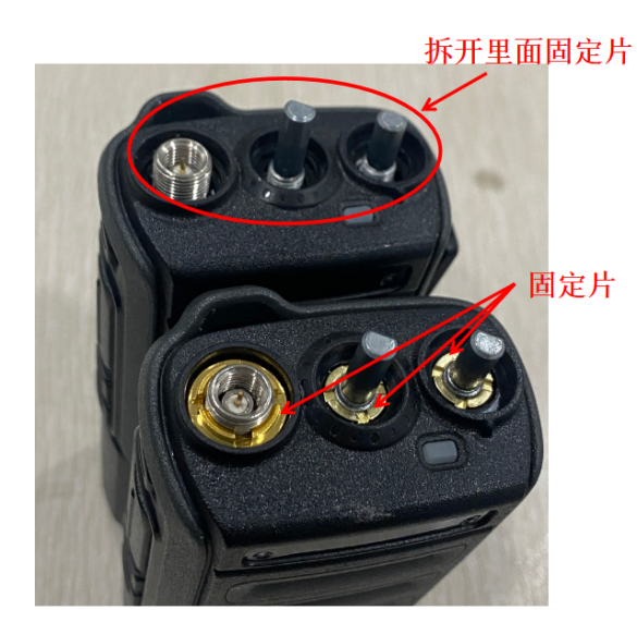 ①先把电池抓下来,然后把对讲机天线与两个旋纽拆下,再把里面固定的贴片通过旋转拆下来。