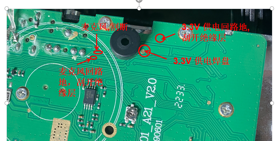 根据降噪模块规格书,知道需要连接供电(3.3V)、地、麦克风线路,我们分别在对讲机上查找这些网络。把一些地铜皮刮开,麦克风的连接线割断。