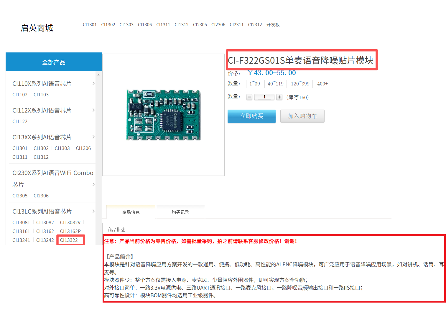 ①选择一套CI-F322GS01S单麦语音降噪贴片模块,网址如下:启英商城。
