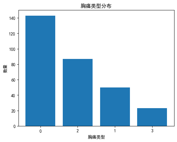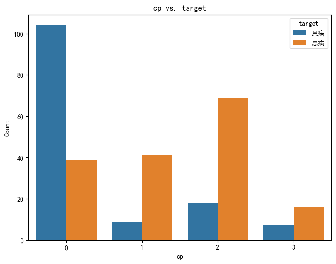 不同胸痛类型(cp)对应的患病群体数量差异显著,说明胸痛类型与心脏病患病情况存在关联性。
