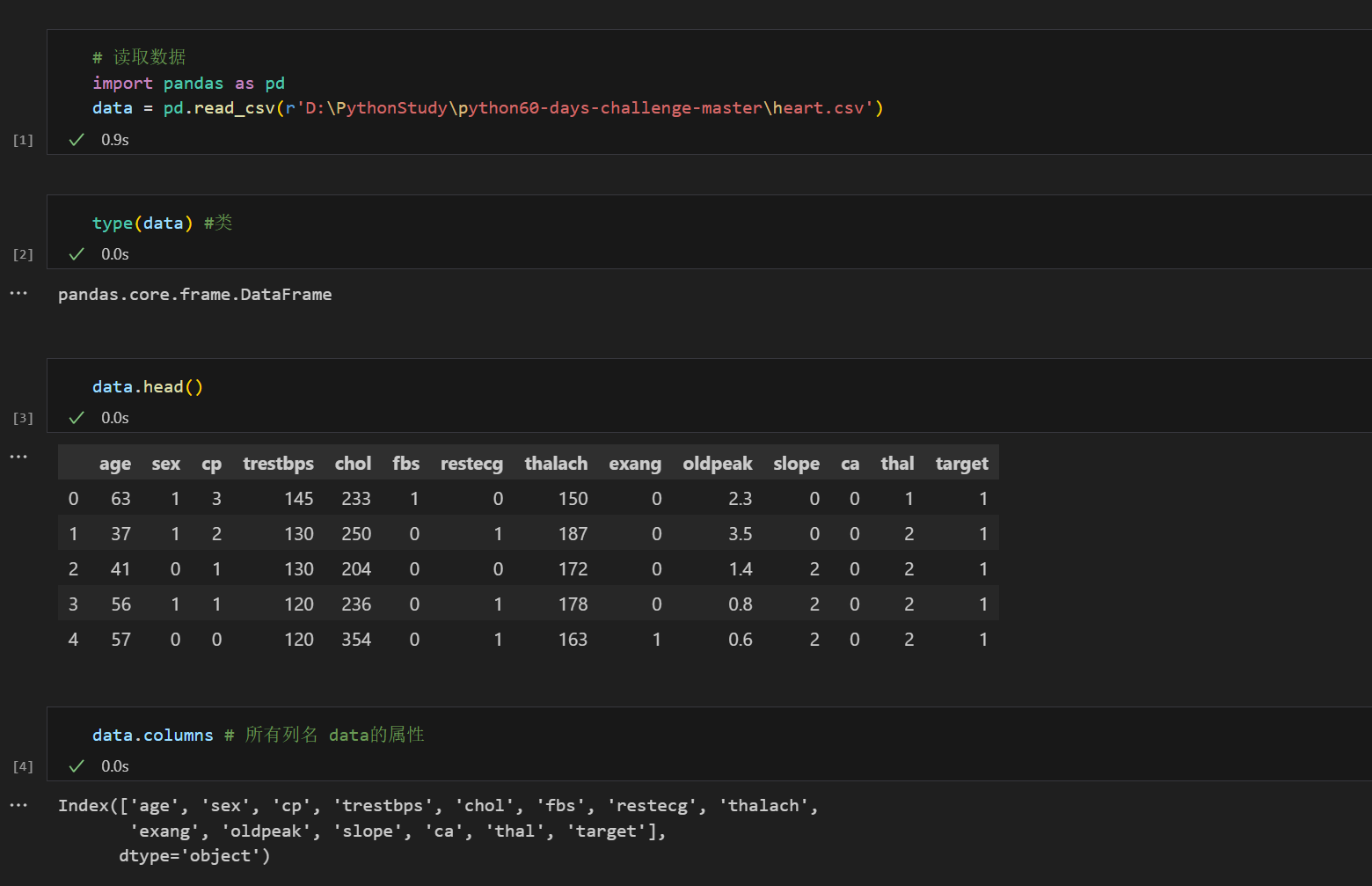 勇闯python的第7天,已经一周了,一周学下来,从对 Python 一窍不通,到现在能捣鼓出些东西出来,感觉自己进步了很多。虽然还有很多不懂的地方,但这种每天都有新收获的感觉,真的很不错,希望能够一直坚持下去!exang:运动诱发的心绞痛(exercise induced angina),1 表示是,0 表示否。利用电脑插件的大模型功能(解释)来解读,比翻译效果好(我是夸克网盘的,其他软件也有很