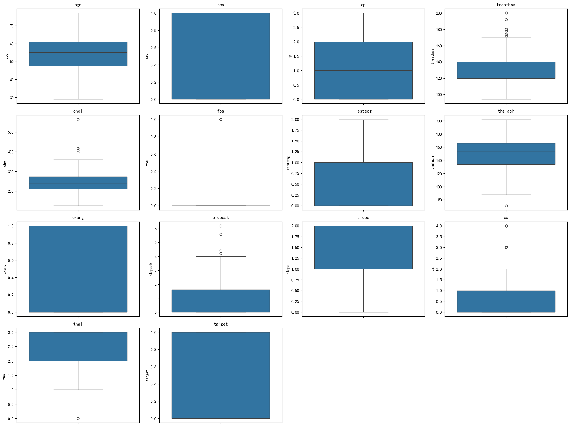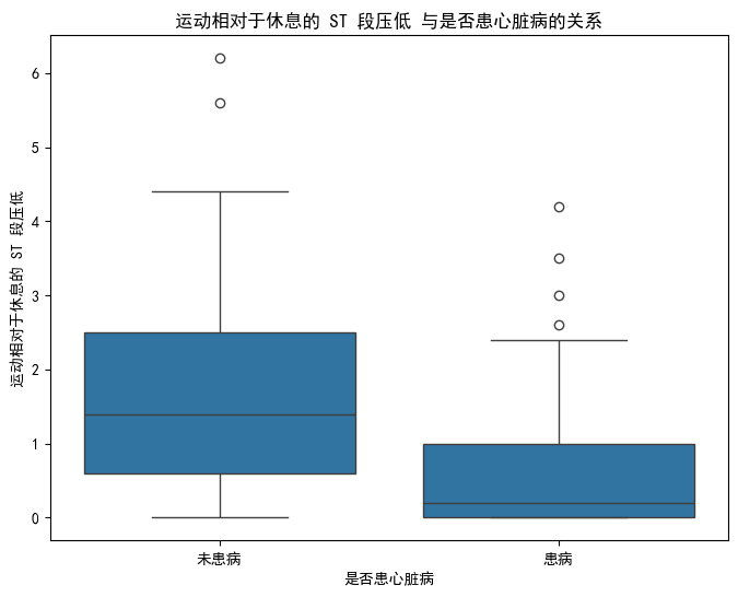 结论:thalach(最大心率)和oldpeak(运动 ST 段压低)在两类人群中的分布差异较显著,对区分是否患心脏病的参考价值更高;而trestbps(静息血压)和chol(血清胆固醇)的区分度相对较弱。