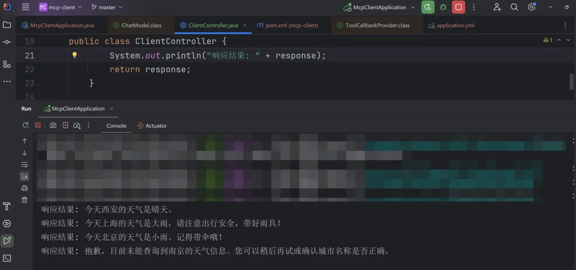 到这里使用 Spring AI 就实现了 MCP Client 和 Server 的调用了,可以看出 MCP 的推出只是为了增强大模型的能力的,有了 MCP 协议之后,任何大模型就可以调用任意实现了 MCP Server 的服务了,这样就无线扩充了大模型的能力,为 AI 的发展提供了标准的协议和便利的对接。