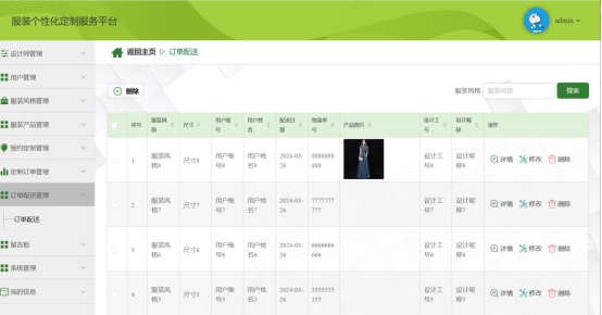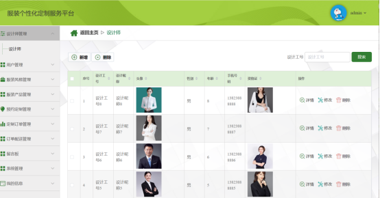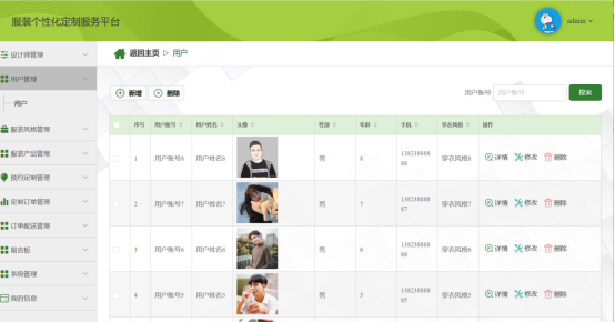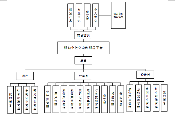 (1)功能要求:管理人员可以管理自己的个人中心,对设计师管理、用户管理、服装风格管理、服装产品管理、预约定制管理、定制订单管理、订单配送管理、留言板、系统管理、我的信息等进行管理。