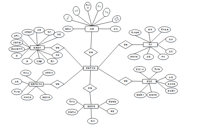 ER图是由实体及其关系构成的图,通过E/R图可以清楚地描述平台涉及到的实体之间的相互关系。在平台中将对“收藏、在线客服、用户、服装资讯、留言板、服装产品评论”等作为实体,它们的局部E-R图,如图4-2所示: