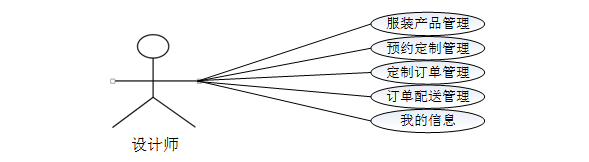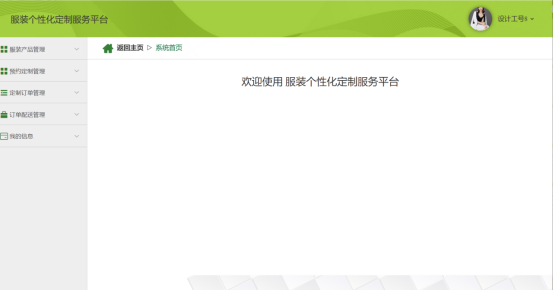 设计师进入主页面,主要功能包括对服装产品管理、预约定制管理、定制订单管理、订单配送管理、我的信息等进行操作。设计师主页面如图5-12所示: