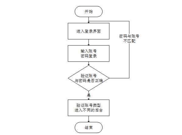 登录流程是该平台的第一个流程,登录的第一步是输入账号、密码登录,平台会验证账号与密码是否正确,正确时平台会判断账号类型再进入不同的后台;不正确时,会返回到登录的第一步,输入用户重新执行登录流程。该流程如图3-4所示。