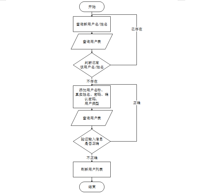 添加新用户的流程是先查询新用户名是否已存在,如已有该用户名,需重拟用户名并同时输入新用户的其它信息,添加新用户到数据库时会先验证数据是否完整,信息都正确且完整时,返回并刷新用户列表;信息不正确时,会返回输入信息的那一步。该流程如图3-5所示。