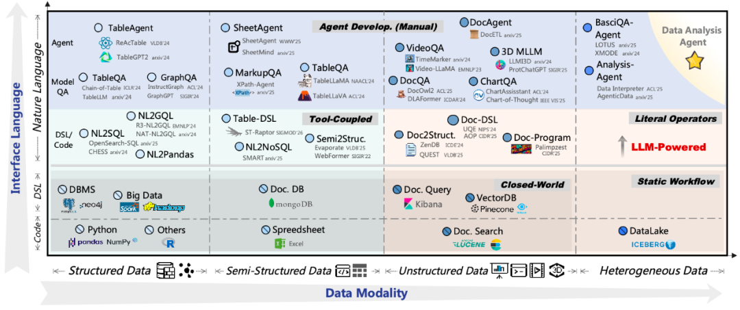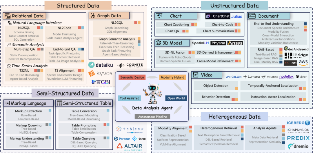 图 2:LLM/Agent-as-Data-Analyst 技术总览,涵盖本文具体讨论的四大数据模态:结构化数据、半结构化数据、非结构化数据和异构化数据。