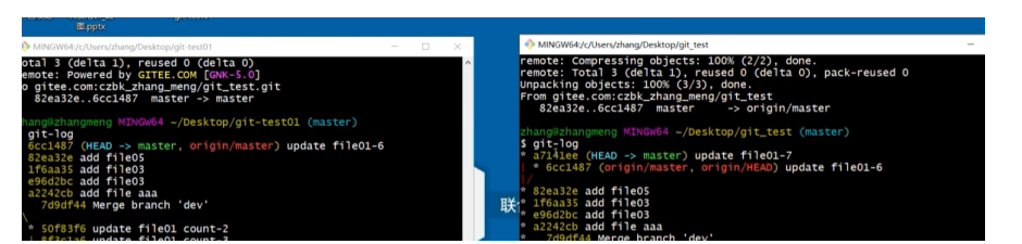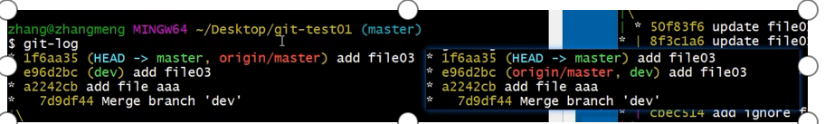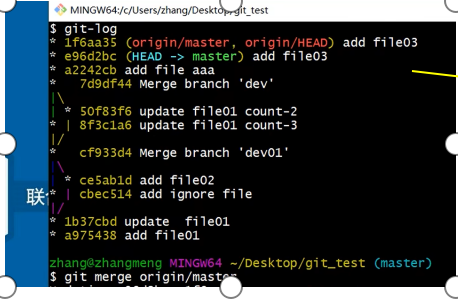比如别人本地上传了一个文件,git-log查看如右图--两个分支都会添加该文件