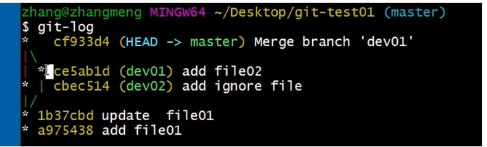 在mster分支之下执行合并分支的命令,就是把dev01中修改的操作覆盖到master上