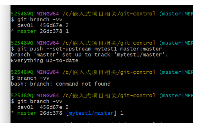 (git branch-vv是查看本地分支和远端仓库分支的对应关系)