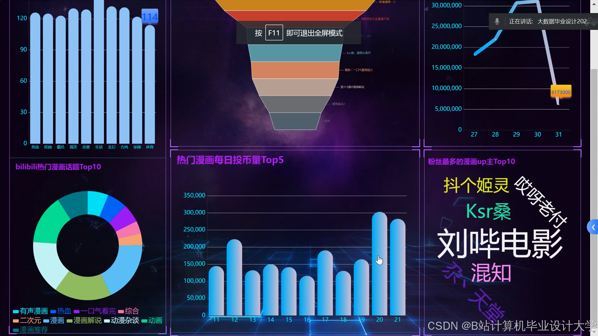 前端框架(如React、Vue)结合Ajax、WebSocket技术,实现前后端数据交互,确保推荐结果的实时更新。用户行为分析大屏通过ECharts展示观看时长、收藏率、评论分布等指标,支持时间维度与动漫类型维度的下钻分析。例如,某系统用折线图对比不同算法的准确率、召回率、F1分数,结合用户点击率(CTR)优化模型。