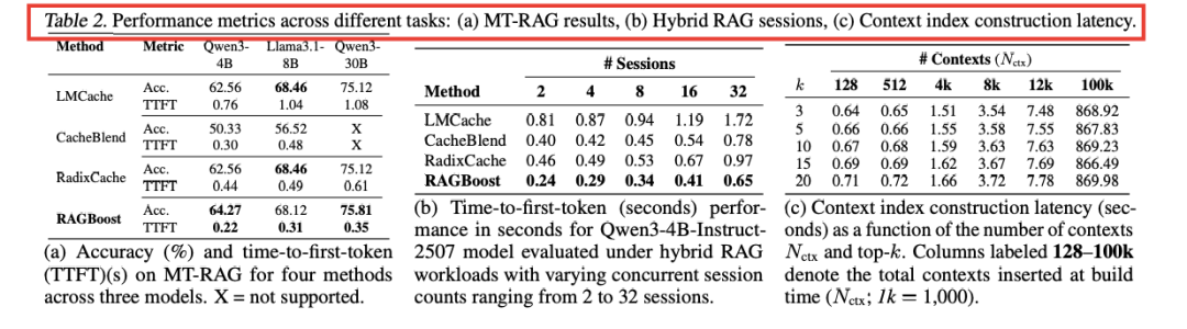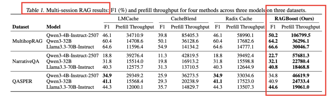 表1 多会话 RAG 结果:F1 与预填充吞吐量对比