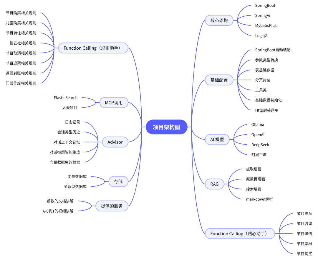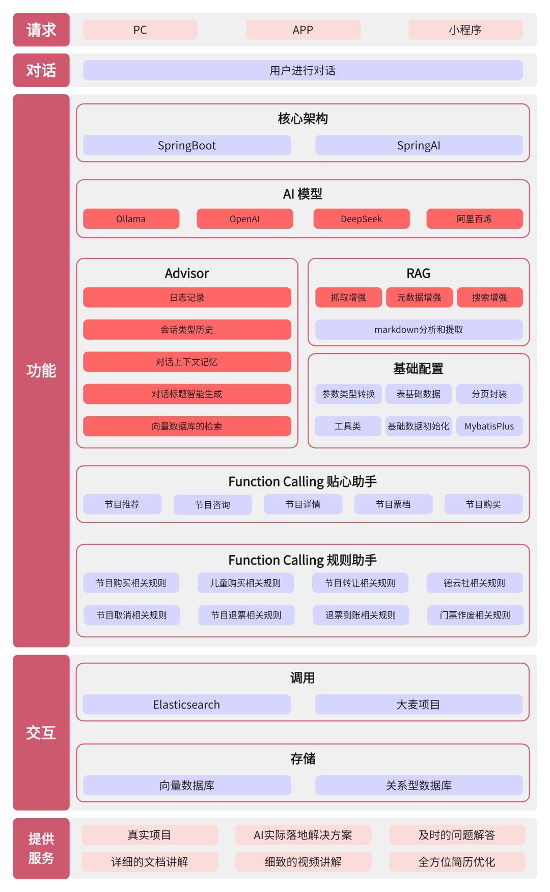 项目在使用 AI 模型时,有多个模块功能,包括 Springboot 和 SpringAI 的结合、RAG 和向量数据库的解释、SpringAI 操作向量数据库、MCP 和 Function Calling 操作数据、AI的拦截器 Advisor 的高阶用法等等… …