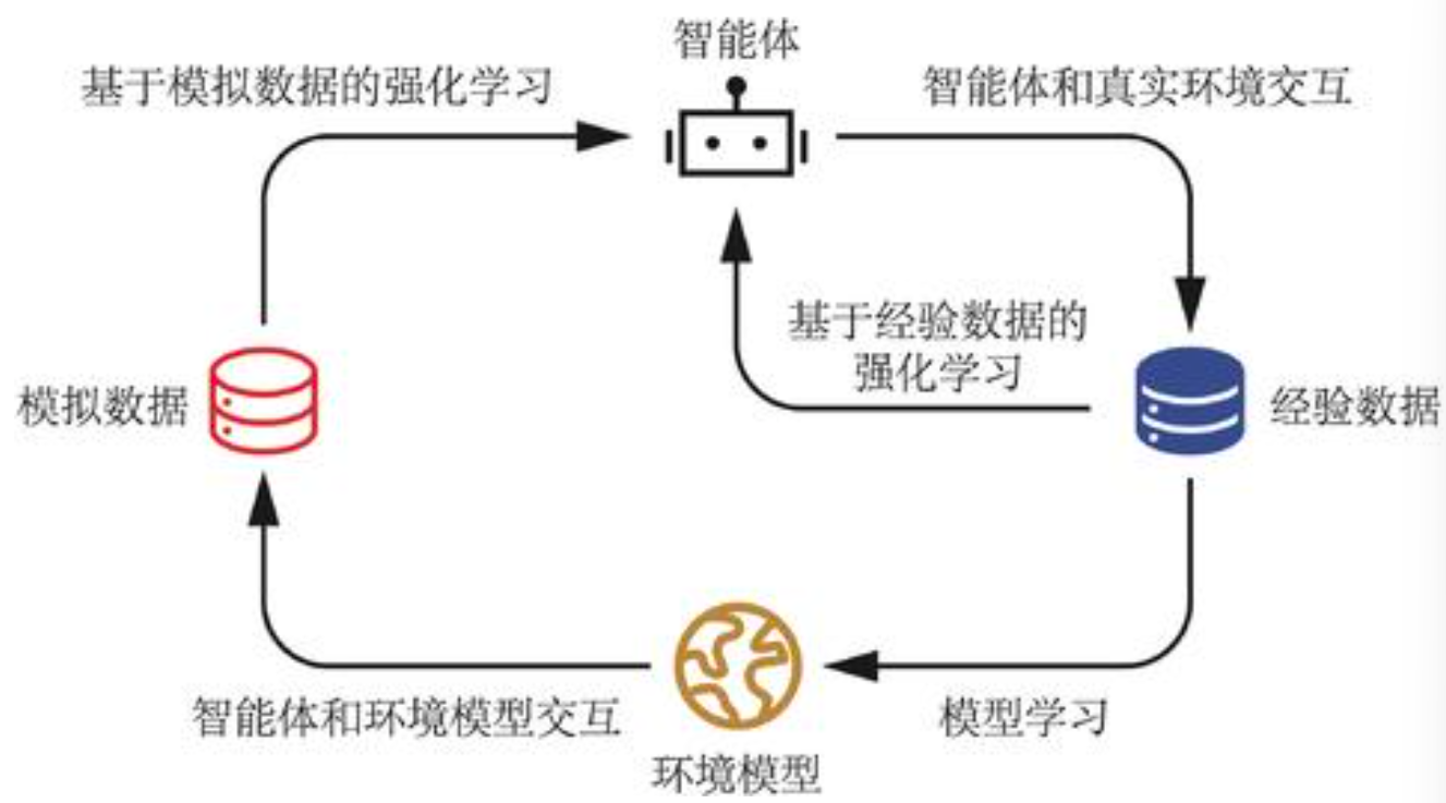 无模型的强化学习根据智能体与环境交互采样到的数据直接进行策略提升或者价值估计,Sarsa 和 Q-learning 算法,便是两种无模型的强化学习方法,本书在后续章节中将要介绍的方法也大多是无模型的强化学习算法。