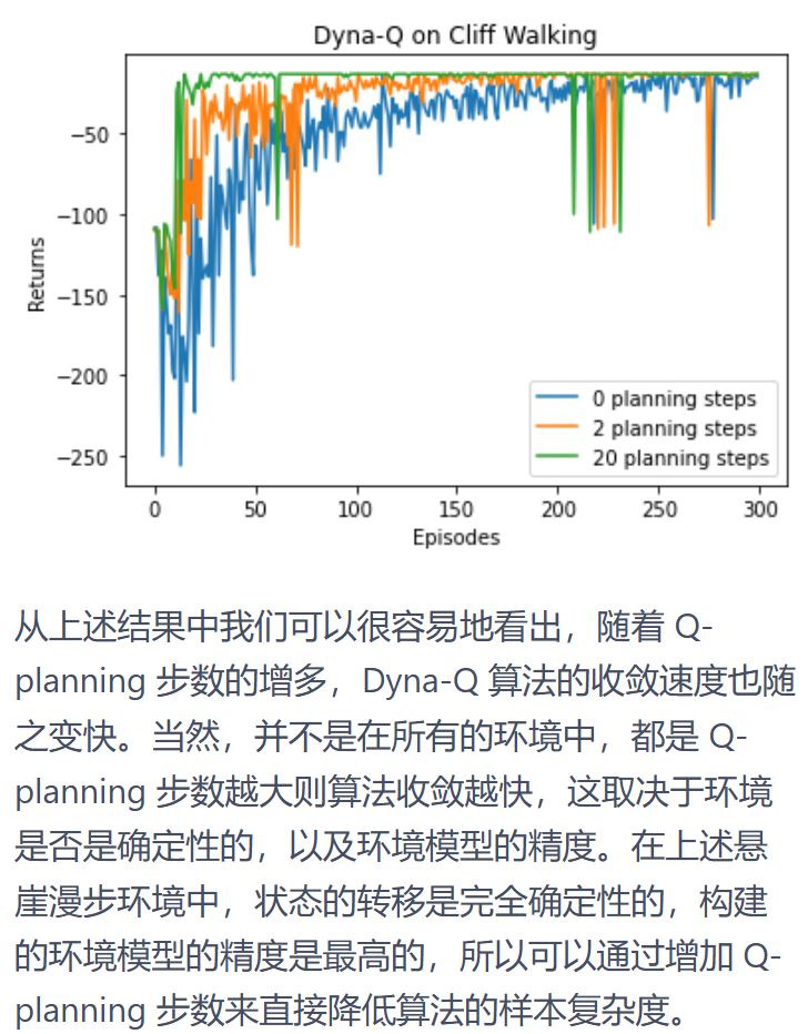 本章讲解了一个经典的基于模型的强化学习算法 Dyna-Q,并且通过调整在悬崖漫步环境下的 Q-planning 步数,直观地展示了 Q-planning 步数对于收敛速度的影响。我们发现基于模型的强化学习算法 Dyna-Q 在以上环境中获得了很好的效果,但这些环境比较简单,模型可以直接通过经验数据得到。如果环境比较复杂,状态是连续的,或者状态转移是随机的而不是决定性的,如何学习一个比较准确的模型就变成非常重大的挑战,这直接影响到基于模型的强化学习算法能否应用于这些环境并获得比无模型的强化学习更好的效果。