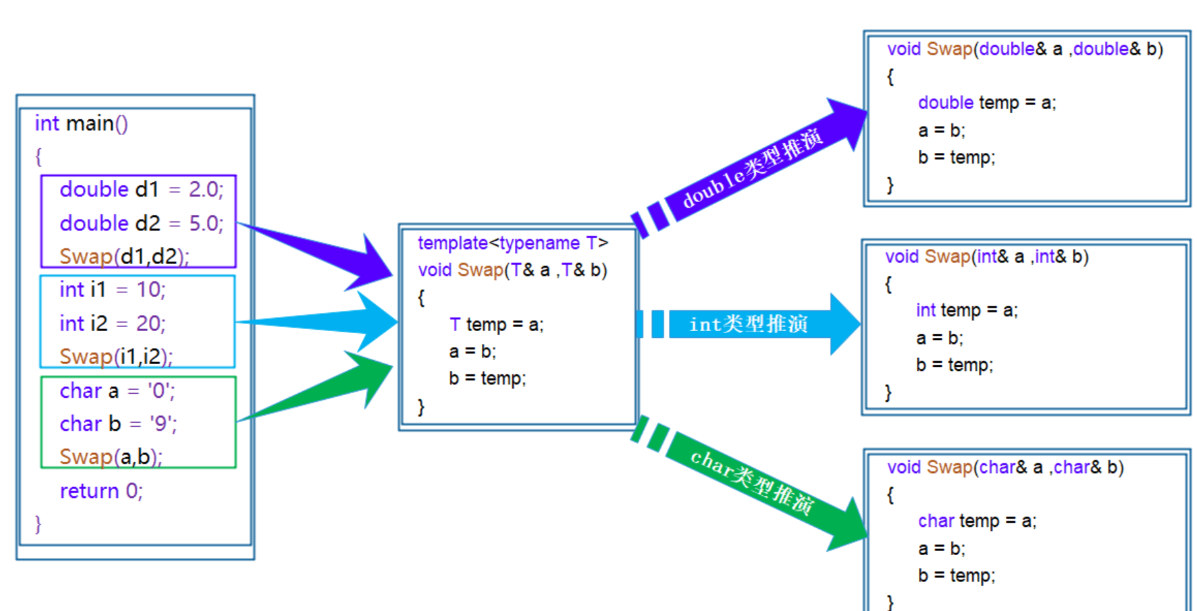 在编译器编译阶段,对于模板函数的使用,编译器需要根据传入的实参类型来推演生成对应类型的函数以调供调用。比如:当用double类型使用函数模板时,编译器通过对实参类型的推演,将T类型确定为double类型,然后产生一份专门处理double类型的代码,对于字符类型也是如此。