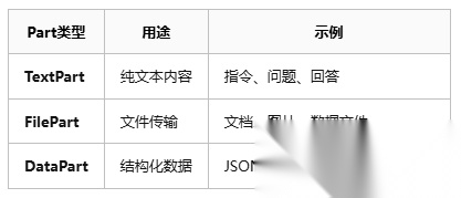 一个Artifact可以包含多个部分(parts),每个部分(part)可以是:文本、文档、图像 等,涉及纯文本、文件 和 结构化数据。